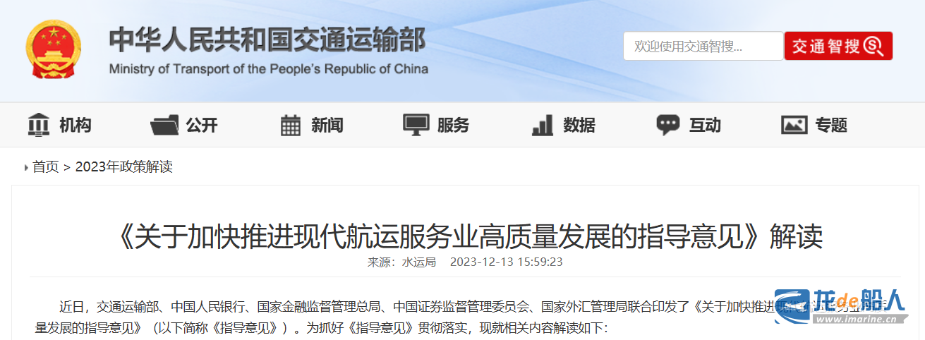 12月13日消息,交通运输部、中国人民银行、国家金融监督管理总局、中国证券监督管理委员会、国家外汇管理局联合印发了《关于加快推进现代航运服务业高质量发展的指导意见》。