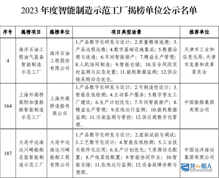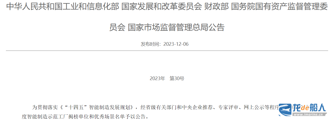 多家船企获智能制造国家级荣誉 来源:龙de船人 2023-12-14 10:52 12月6日,工业和信息化部、国家发展和改革委员会、财政部、国务院国有资产监督管理委员会、国家市场监督管理总局联合发布2023年度智能制造示范工厂揭榜单位和优秀场景名单,船舶行业多家单位入选。 2023年度智能制造示范工厂揭榜单位公示名单 2023 年度智能制造优秀场景公示名单 本站文章如未标明来源,均为本站编译、编辑或原创文章,转载请注明来自“龙de船人”,违者必究。