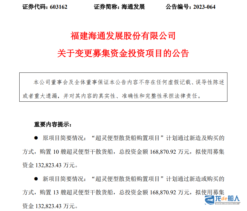 公告披露,海通发展拟将“超灵便型散货船购置项目”规划购买的超灵便型干散货船舶数量由10艘增加至13艘。变更后的“超灵便型散货船购置项目”计划通过新造或购买的方式,购置13艘超灵便型干散货船,总投资金额约16.89亿元,拟使用募集资金约13.28亿元。