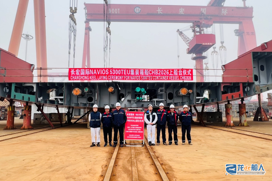 同日,舟山长宏国际为希腊船东NAVIOS MARITIME PARTNERS L. P.建造的第9艘5300箱集装箱船CHB2026顺利上船台,正式转入船台搭载阶段。