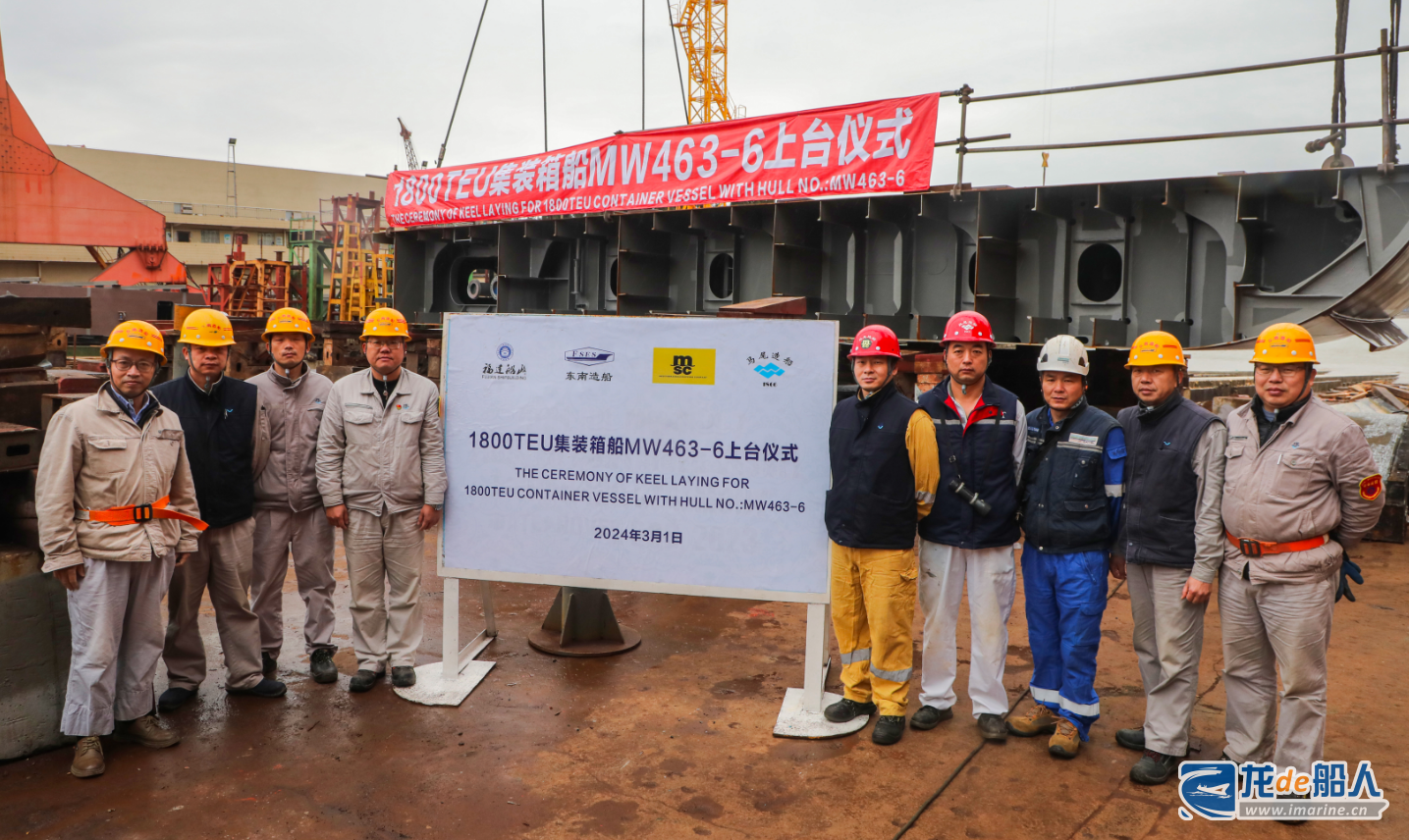 3月1日,福建船政旗下企业东南造船为地中海航运公司(MSC)建造的1800TEU集装箱船(MW463-6)在冠海基地顺利上船台。