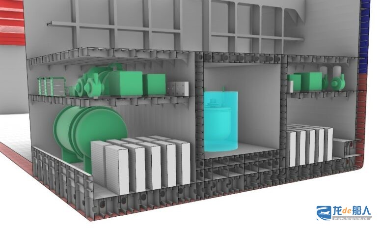 该型船采用国际第四代堆型熔盐反应堆解决方案,其安全性高、反应堆高温低压运行,在原理上规避堆芯融化,具备防扩散与固有安全特征。采用无序耐高压容器与管路,即便发生破口事故,在环境温度下迅速凝固,事故后除正常停堆手段外还可以把熔料盐排出堆外,实现快速停堆、防止事故扩展。此外,该型船动力装置布置于船舶安全位置,电力系统采用双侧冗余设计,充分保证供电系统安全,并具备从人员聚集区应急撤离功能。