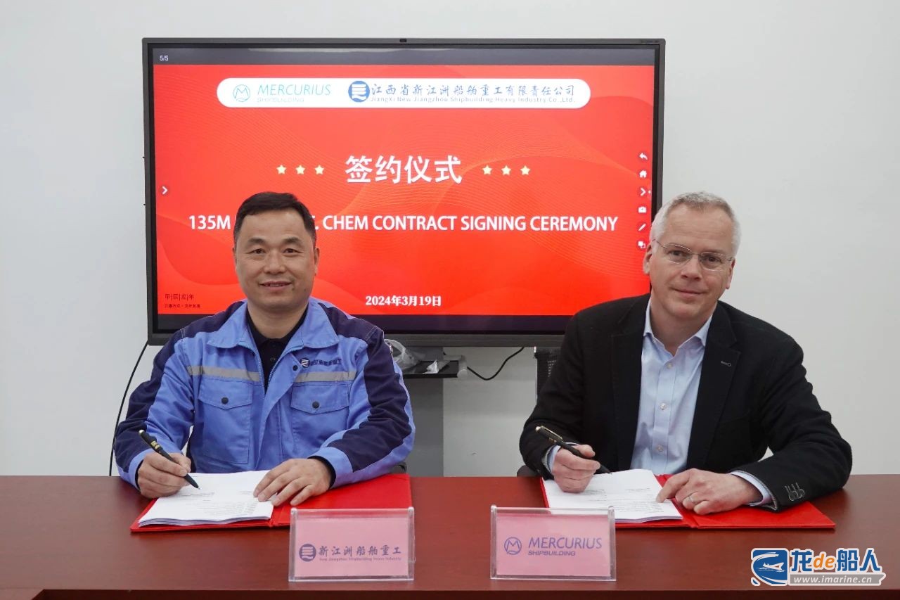 3月19日,江西省新江洲船舶重工有限责任公司(以下简称“新江洲船舶重工”)和荷兰船东MERCURIUS SHIPBUILDING B.V公司(以下简称“MERCURIUS”)举行4艘135米双相不锈钢化学品船签约仪式。