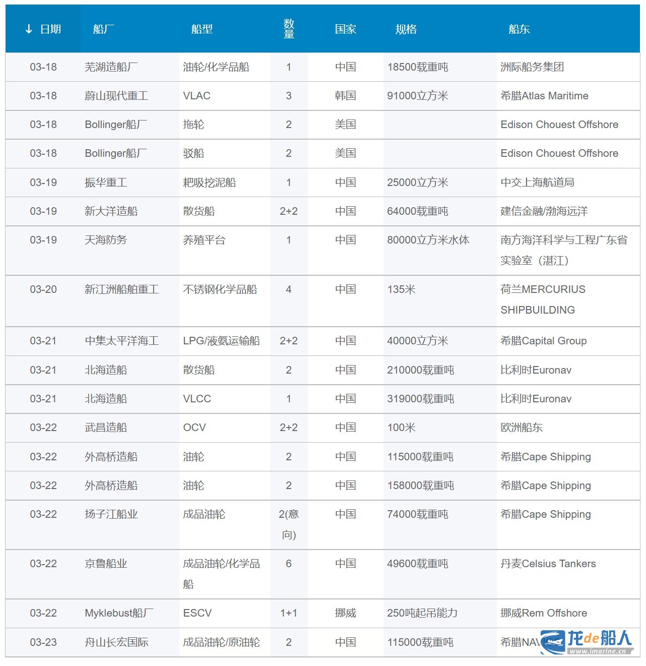 据龙船订单库(https://www.imarine.cn/order)跟踪统计,上周(3.18-3.24)公布的新船订单有38+7艘。