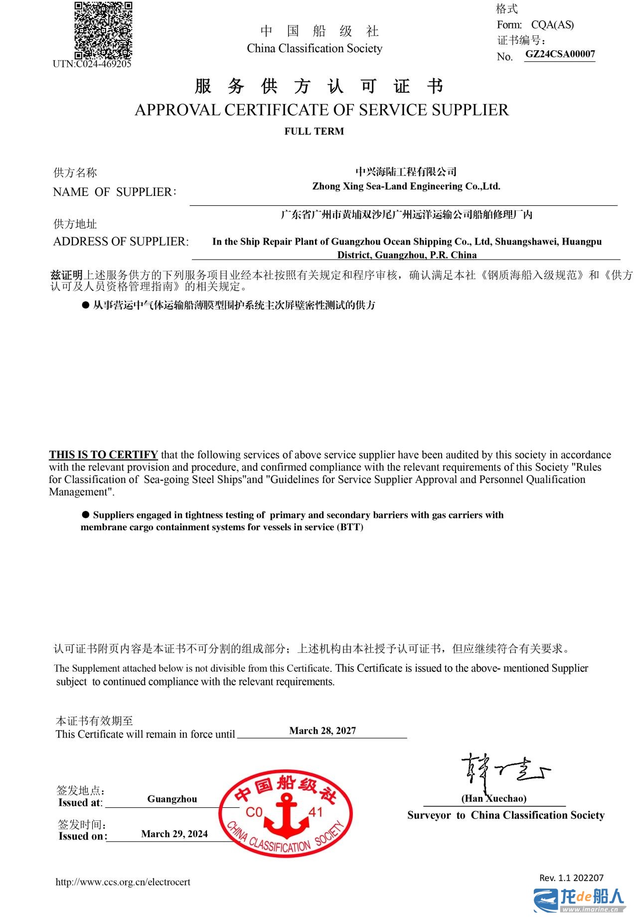 4月10日,中兴海陆工程有限公司(以下简称“中兴海陆”)“营运中气体运输船薄膜型围护系统主次屏壁密性测试项目(BTT)”顺利通过中国船级社(以下简称“CCS”)认证,成功取得CCS全球首张认可证书。