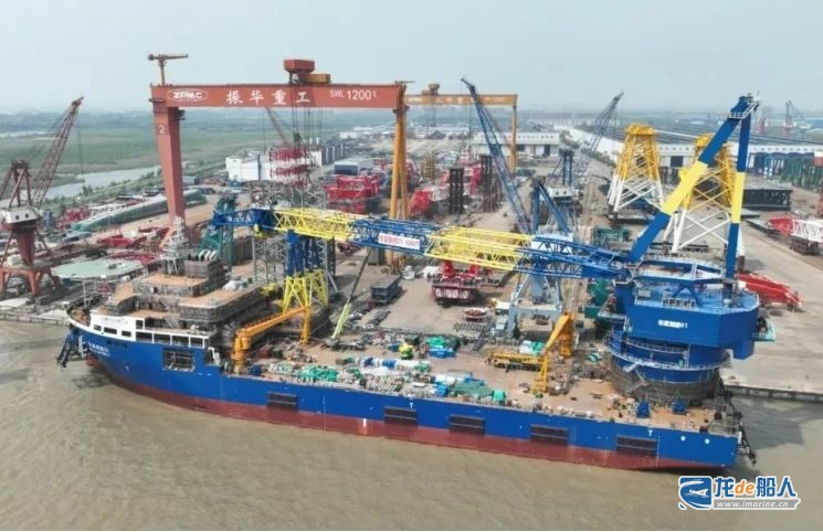 5月7日,振华重工为华夏金租建造的首艘5000吨自航式全回转起重船在振华重装码头完成起重机总装。