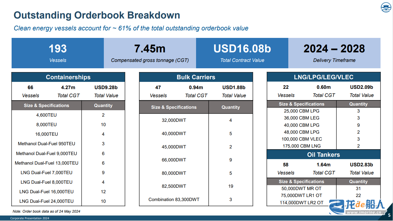 公告披露,截至2024年5月24日,扬子江船业集团手持订单量累计193艘、价值160.8亿美元,涵盖集装箱船、散货船、气体运输船以及油船等多个船型,具体如下: