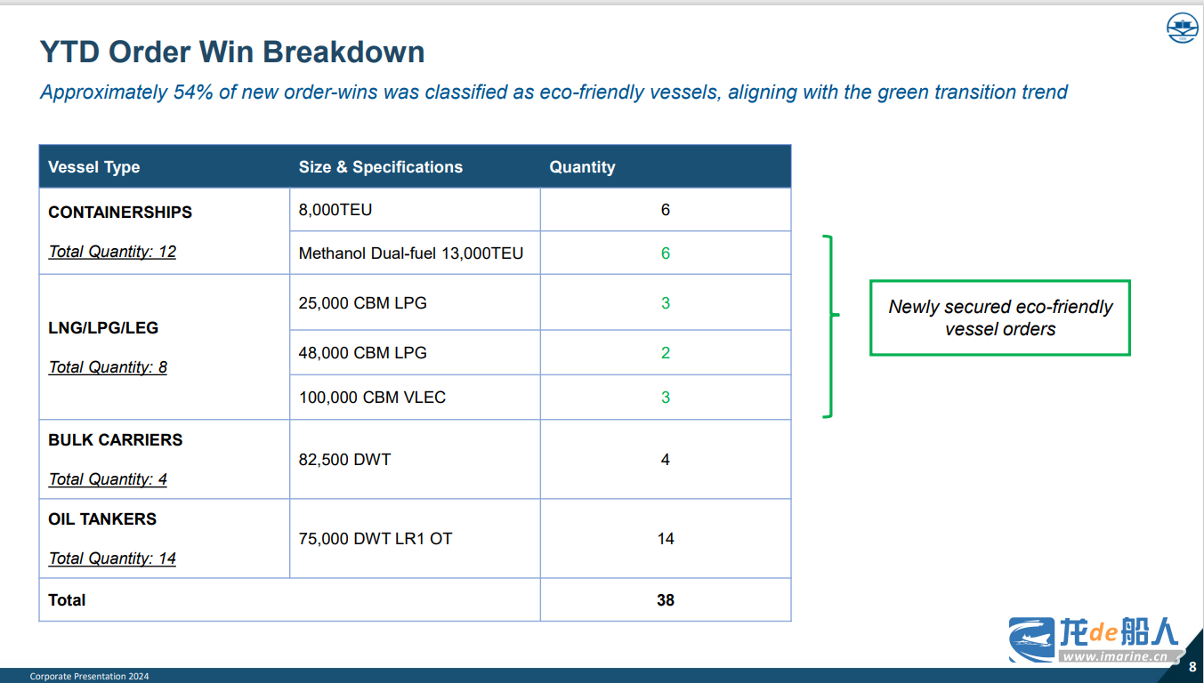 根据公告,扬子江船业今年以来共承接38艘新船,包括14艘75000载重吨LR1型成品油轮;3艘25000立方米LPG运输船、2艘48000立方米LPG运输船和3艘100000立方米VLEC;4艘82500载重吨散货船;6艘13000TEU甲醇双燃料动力集装箱船、6艘8000TEU集装箱船。