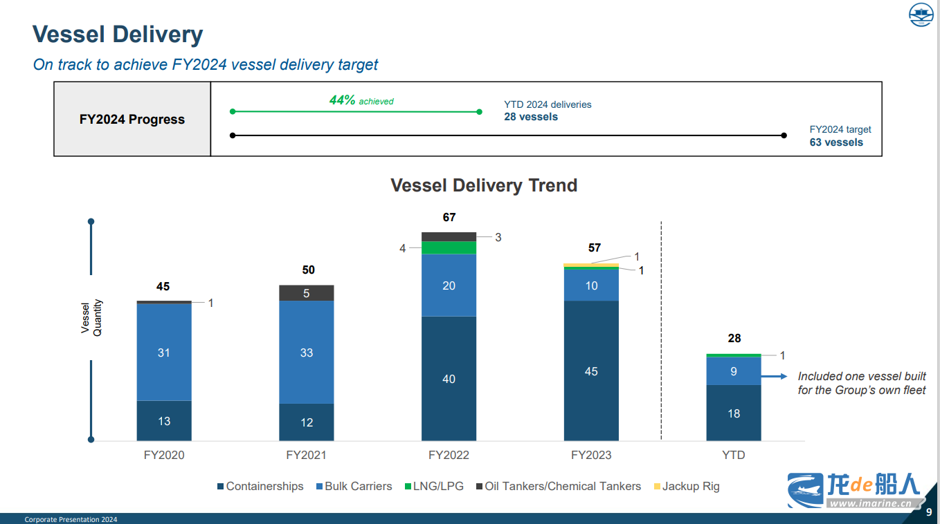 自今年以来,扬子江船业共计完工交付28艘新船,实现全年交船目标的约44%,包括18艘集装箱船、9艘散货船以及1艘气体运输船。