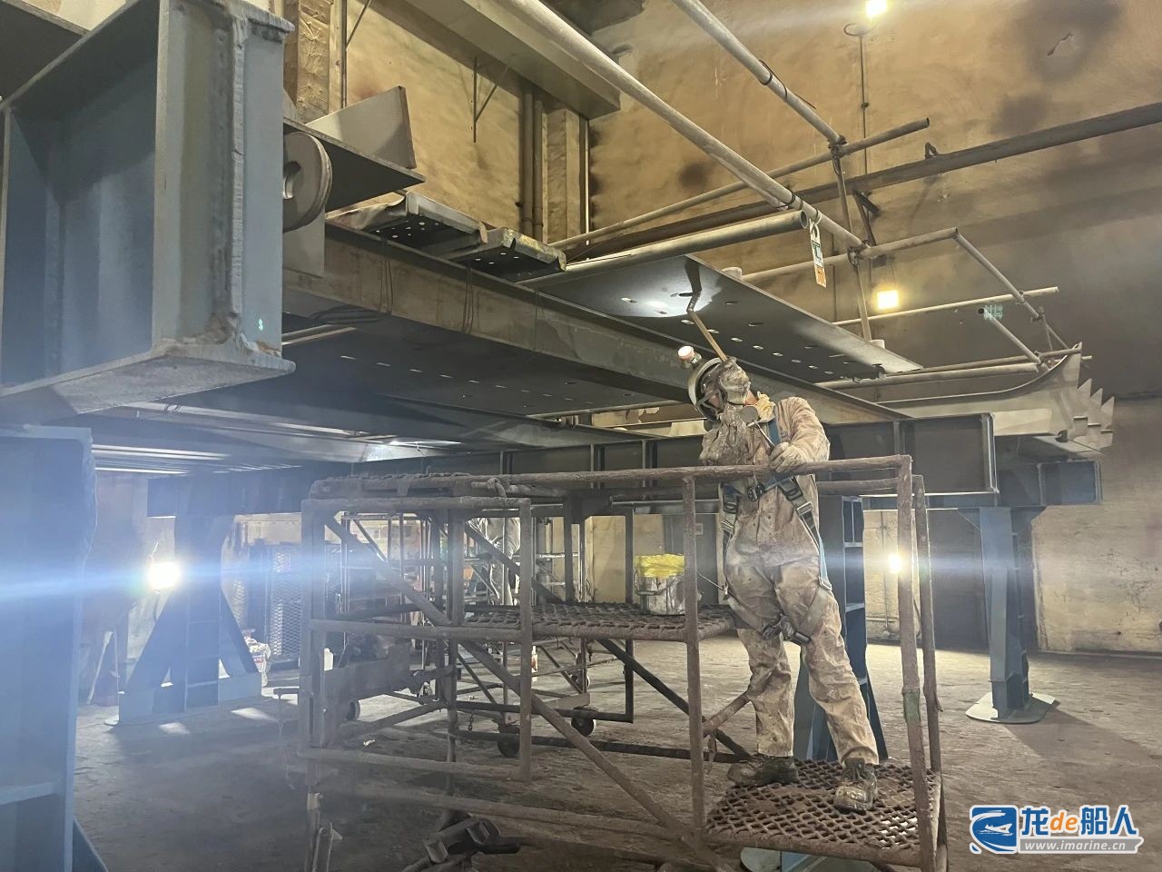 近日,外高桥海工首制8600 CEU PCTC项目H1600船首制主船体分段冲砂外检报验顺利通过,涂装阶段施工正式开始。