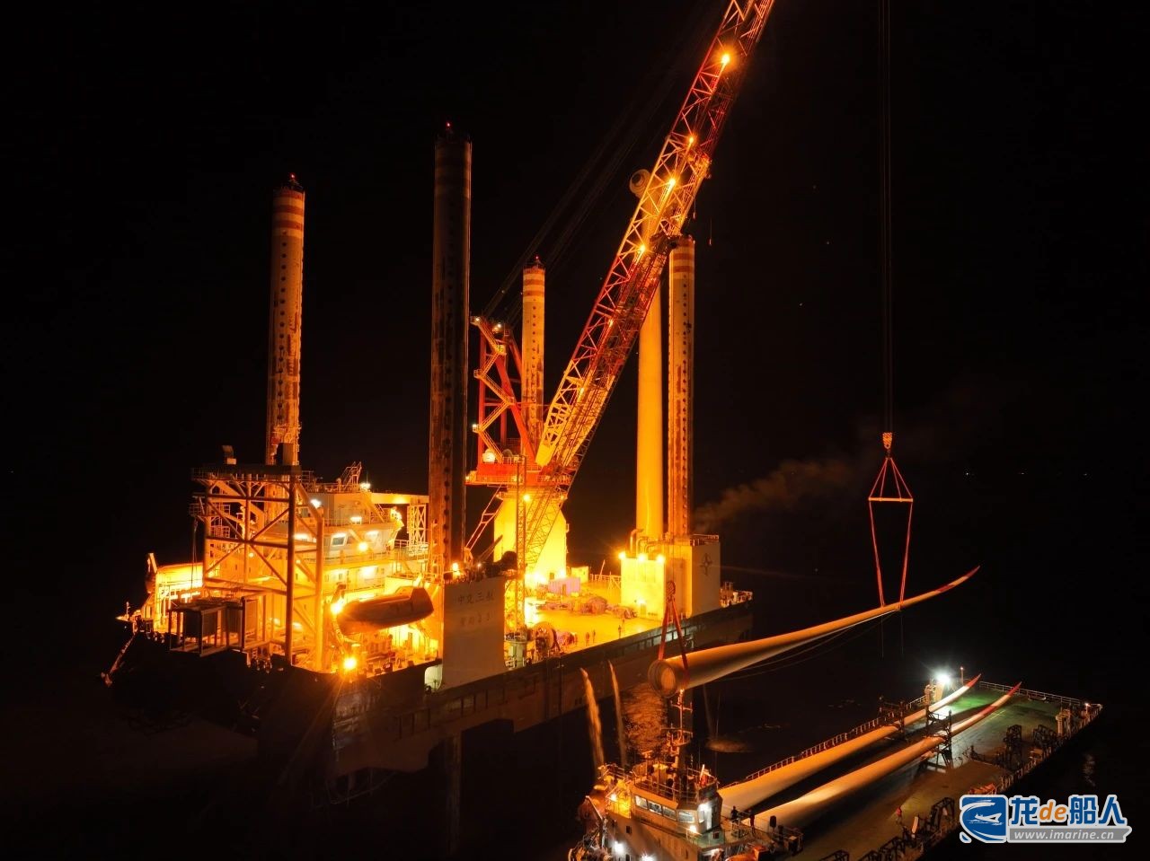 风场地质特殊,风机安装船桩腿入泥深度较浅,严重限制主钩旋转和抬臂能力,导致无法将风叶一次性起吊安装到位。项目团队优化吊装方案,在风机安装船大臂旋转到抬臂盲区时,采用履带吊替换起重船进行吊装,形成“安装船+履带吊”的安装接力新模式。