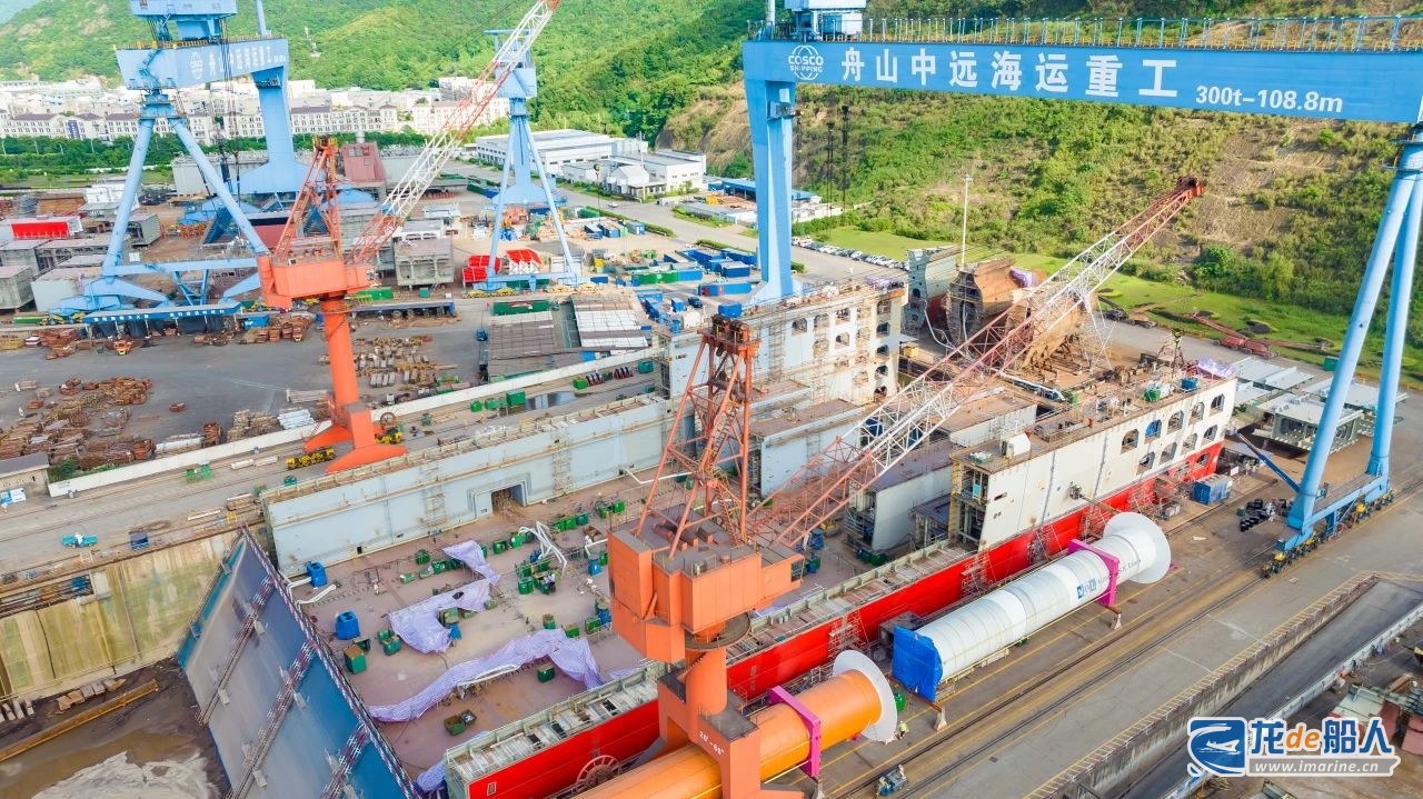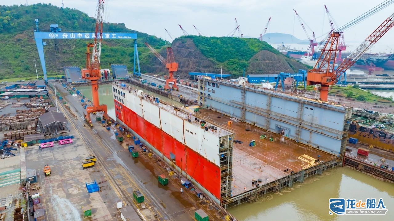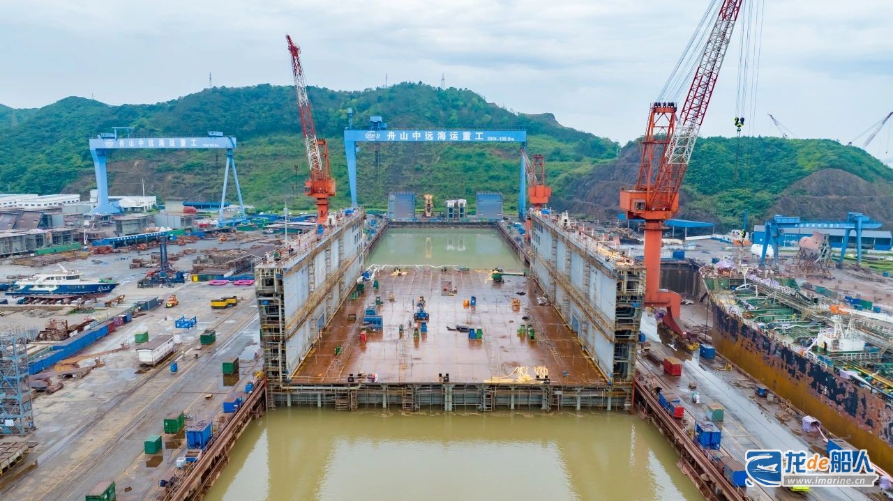 6月27日,舟山中远海运重工建造的75000吨举力浮船坞N1150项目第一环段在该公司2号坞顺利出坞上水。