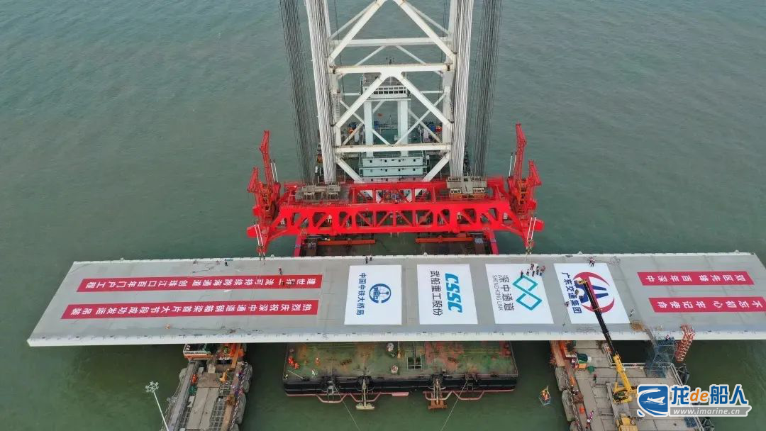 2023年1月12日,深中大桥中跨首片钢箱梁节段完成吊装。