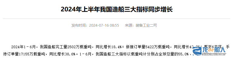 7月16日,工业和信息化部发布我国2024年上半年造船业最新数据,中国造船业三大指标继续稳步增长,全球领先。