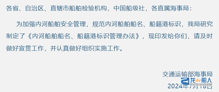 关于印发《内河船舶船名、船籍港标识管理办法》的通知 来源:龙de船人 2024-07-19 13:31 7月18日,交通运输部海事局发布《内河船舶船名、船籍港标识管理办法》。 《内河船舶船名、船籍港标识管理办法》 本站文章如未标明来源,均为本站编译、编辑或原创文章,转载请注明来自“龙de船人”,违者必究。
