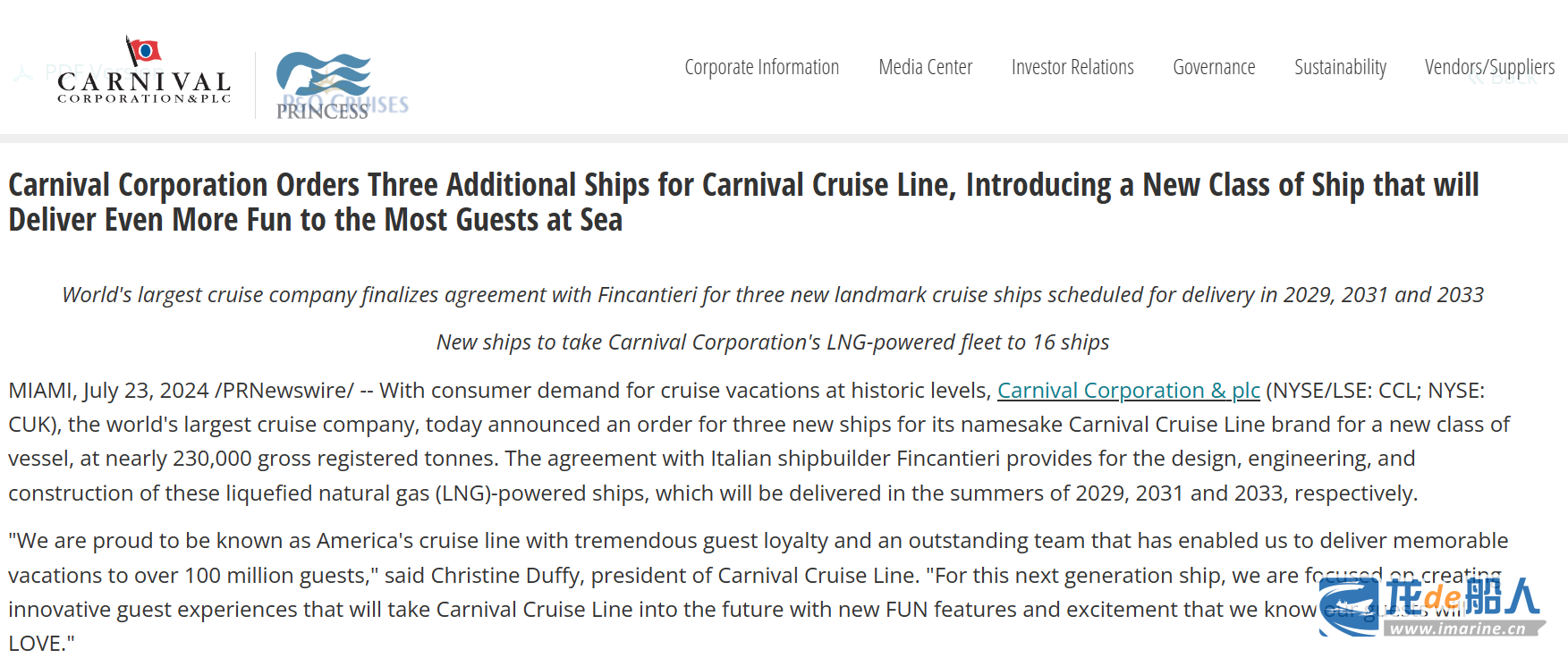 全球最大邮轮公司嘉年华集团7月23日在官网宣布,该集团已与全球最大造船集团之一意大利芬坎蒂尼(Fincantieri)达成协议,将为旗下同名邮轮品牌嘉年华邮轮(Carnival Cruise)设计和建造3艘液化天然气(LNG)动力豪华邮轮,预计分别将于2029年、2031年和2033年夏季交付。