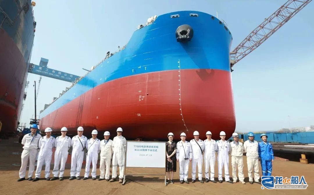 7月19日,大连中远海运重工建造的77000吨多用途纸浆船N1116项目完成船台阶段安装工程、调试工程,顺利拖移。船东驻厂监造组、中国船级社大连分社驻厂组、项目组成员出席下水仪式。