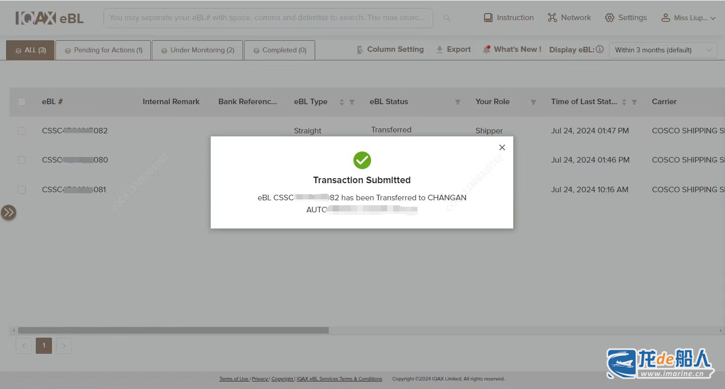 此前,在中远海运集团汽车供应链平台项目组的指导下,中远海运特运与客户团队紧密合作,围绕汽车供应链进一步提质增效需求进行深入探讨,并精心为长安汽车组织了多次GSBN(全球航运商业网络)和IQAX(和易孚)电子提单平台的培训及交流会,为首张框架箱区块链电子提单的成功签发打下了坚实基础。