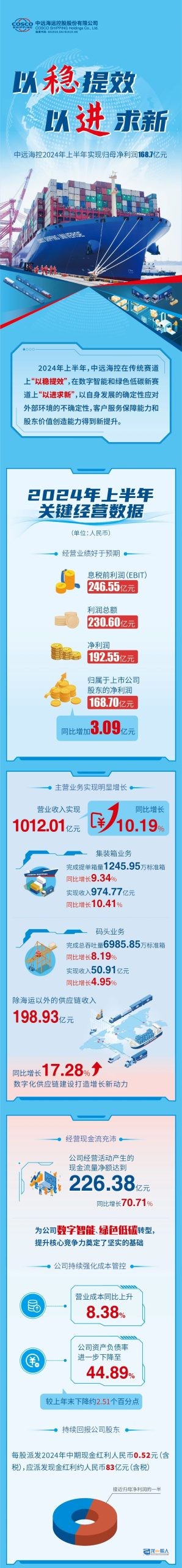8月29日晚间,中远海运控股股份有限公司(中远海控)发布《2024 年半年度报告》,公司营业收入为1012.01亿元,同比增长10.19%。归属于上市公司股东的净利润为168.7亿元,同比增长1.87%。