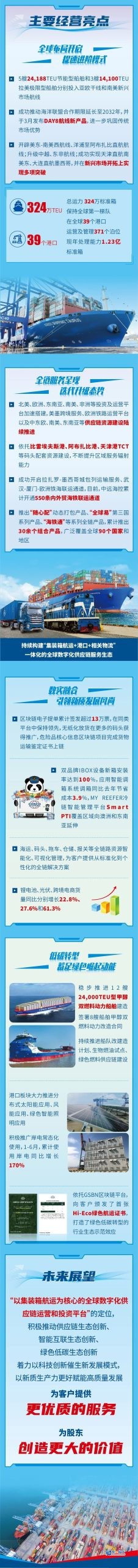 报告期内,中远海运集团加快实施船队结构优化,5艘24,188TEU节能型船舶和3艘14,100TEU拉美极限型船舶先后交付,并分别投入亚欧主干航线和南美新兴市场航线。截至报告期末,中远海运集团自营集装箱船队运力规模达324万标准箱,较期初增长6.5%,船队规模继续保持在行业第一梯队。