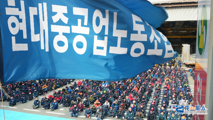 9月4日下午2点30分,韩国金属工人联盟造船工会联合会按计划在蔚山HD现代重工总部大门前举行总罢工决议会议,参会人数超800人。同日,HD现代重工工会、韩华海洋工会分别举行长达4小时的部分罢工HD现代三湖工会举行长达7小时的罢工其余船厂工会也派出高层人员参与罢工
