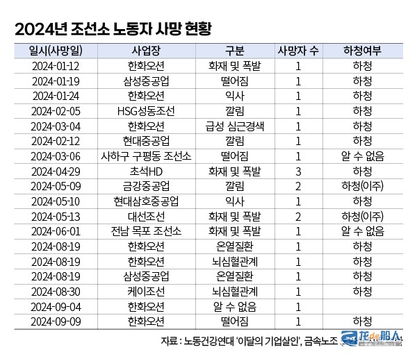 韩国工会联合会下属金属工人工会表示,2024年1月12日至9月9日,韩国船厂共计发生18起致命事故,共造成22名船厂工人死亡,事故船厂包括韩华海洋、三星重工、HD现代重工、HD现代三湖以及HSG城东造船、大鲜造船、K造船等。其中韩华海洋死亡人数最多,达到7人。
