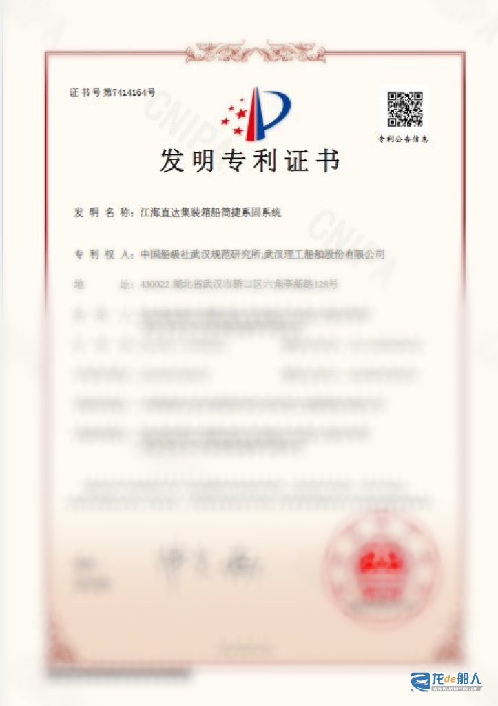 近日,武汉理工船舶公司与中国船级社武汉规范所联合申报的《江海直达集装箱船简捷系固系统》获国家知识产权局授权,并取得发明专利证书。