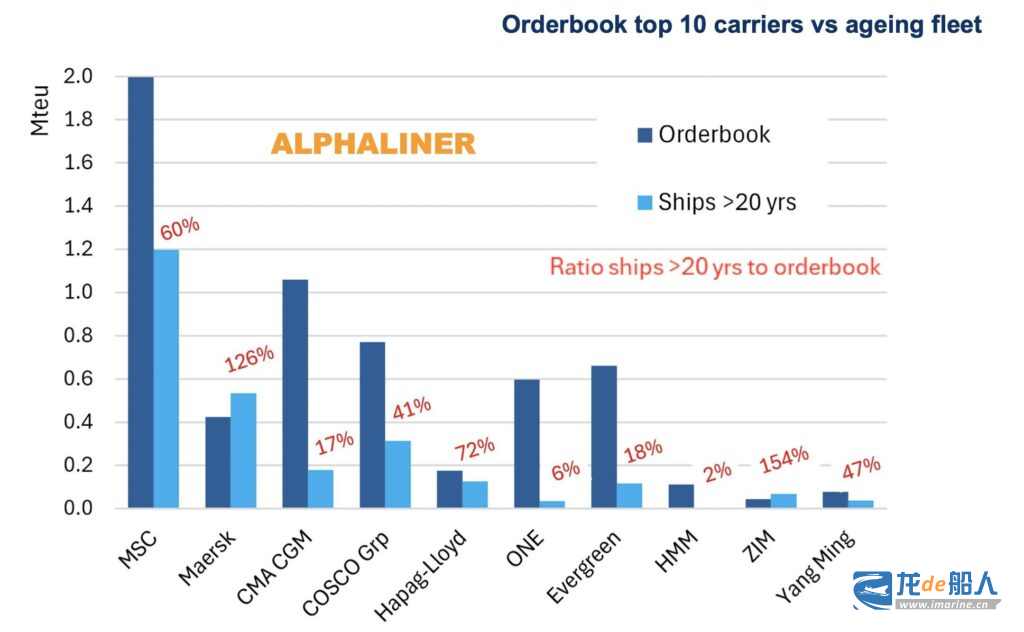 Alphaliner数据显示,只有一家班轮船东没有订购足够数量的新船替换老旧船舶,如上图所示,马士基在更新其老化船队方面明显落后于其他同行,表现得相对不活跃。