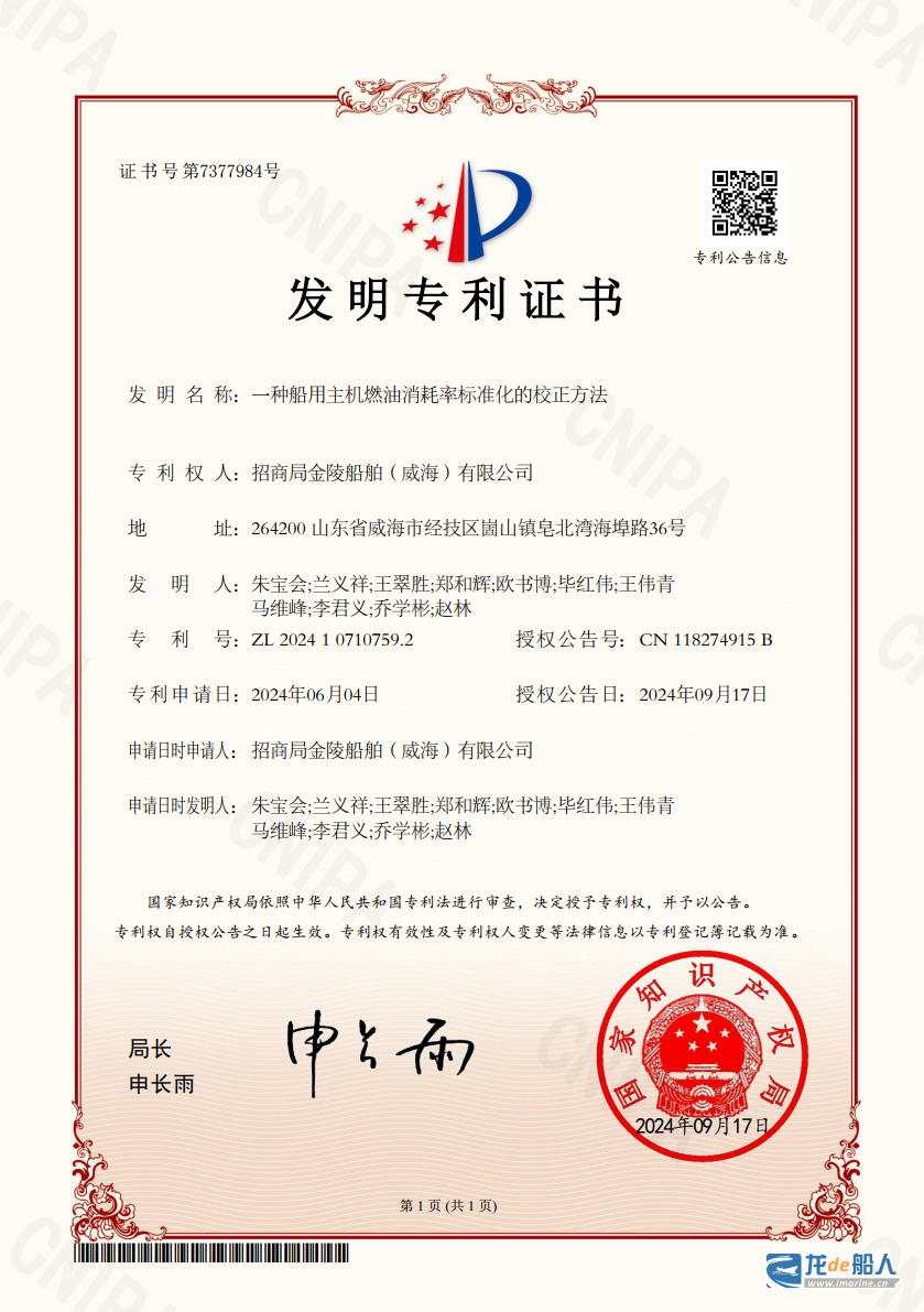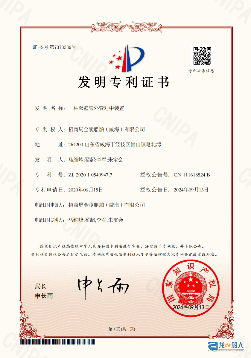 近日,招商工业威海金陵申报的两项成果《一种双壁管外管对中装置》《一种船用主机燃油消耗率标准化的校正方法》获国家发明专利授权,对船舶建造和能效管理具有显著实用价值和推广潜力。
