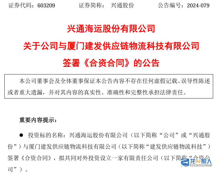 11月5日晚间,兴通海运股份有限公司发布《关于公司与厦门建发供应链物流科技有限公司签署<合资合同>的公告》。