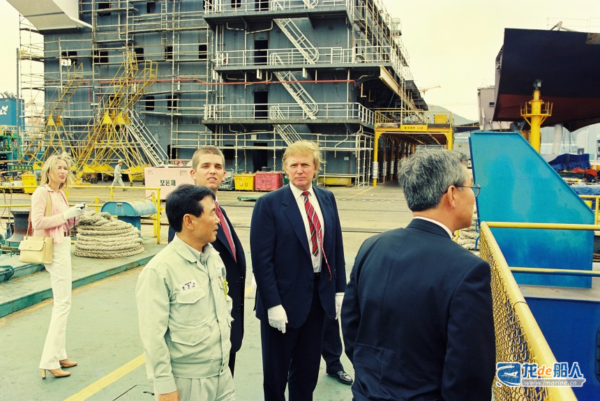 1998年6月5日,特朗普(右二)与长子小唐纳德 · 特朗普(左三)、第二任妻子演员出身的玛拉·梅普尔斯(左一)一起参观大宇造船海洋(现为韩华海洋)。据韩媒报道,特朗普看到100米高的龙门吊后,要求“想上去看看”,上去后他发出“太棒了,不可思议”的感叹。