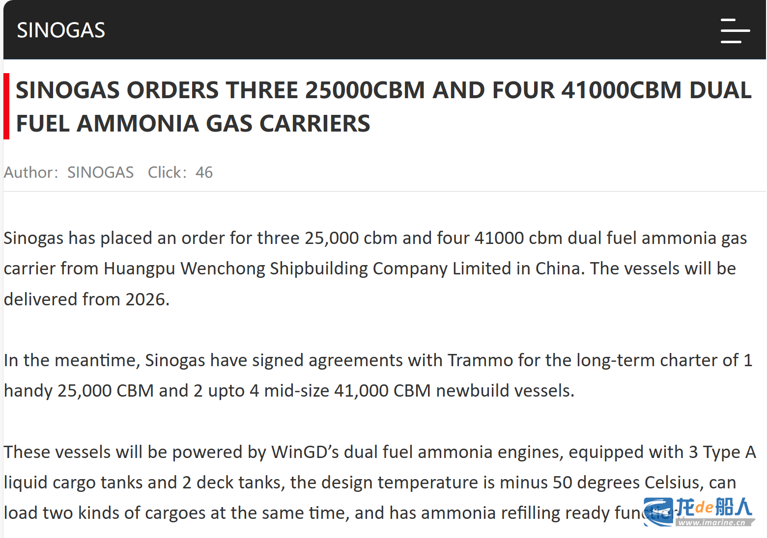 值得注意的是,今年5月份,Sinogas关联公司天津西南海运与黄埔文冲签订了2艘25000方氨双燃料LPG/液氨运输船。该项目是国内首个氨双燃料LPG/液氨运输船建造项目,也是首艘入级CCS船级社的氨燃料气体运输船,满足CCS ice class B级要求、EEDI三阶段要求。