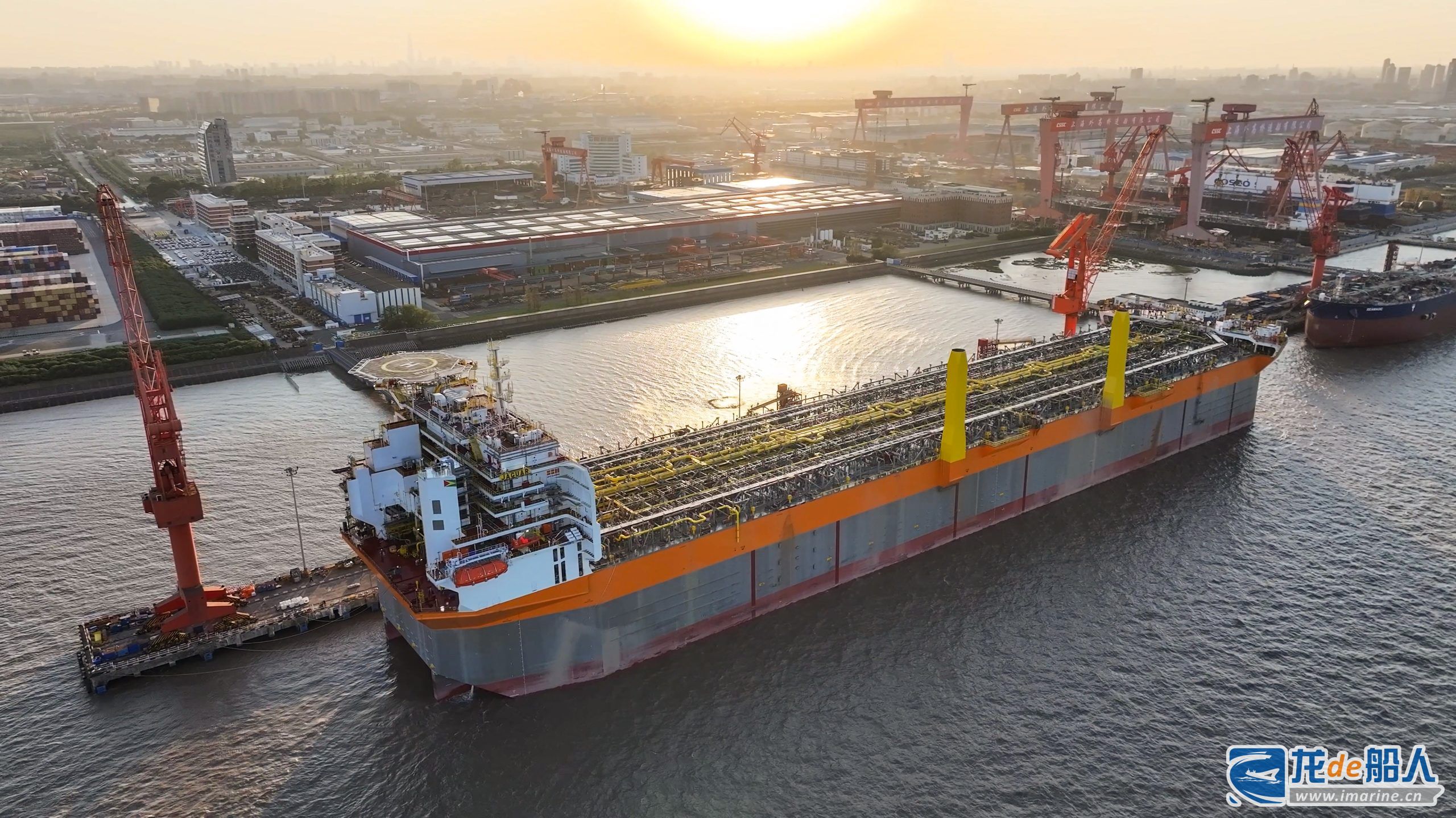 11月14日,由中国船舶集团有限公司旗下上海外高桥造船有限公司为荷兰SBM Offshore公司建造的第5艘世界独创230万桶通用型(Fast4Ward)海上浮式生产储油轮(FPSO)“捷豹”号船体签字交付。
