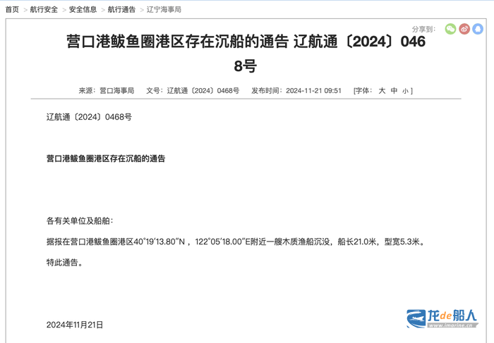 辽宁营口港鲅鱼圈港区一渔船沉没 来源:龙de船人 2024-11-21 11:41 中国海事局网站消息,营口海事局11月21日发布航行通告,据报在营口港鲅鱼圈港区40°19′13.80″N ,122°05′18.00″E附近一艘木质渔船沉没,船长21.0米,型宽5.3米。 本站文章如未标明来源,均为本站编译、编辑或原创文章,转载请注明来自“龙de船人”,违者必究。
