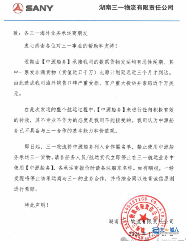 11月27日,湖南三一物流有限责任公司(以下简称“三一物流”)发布声明称即日起将中源船务列入合作黑名单,禁止使用中源船务承运三一货物。