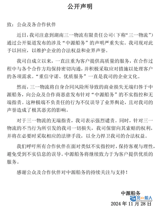 该份声明发出后,中源船务于11月28日上午公开发声明回应,称三一物流涉及中源船务的声明严重失实。