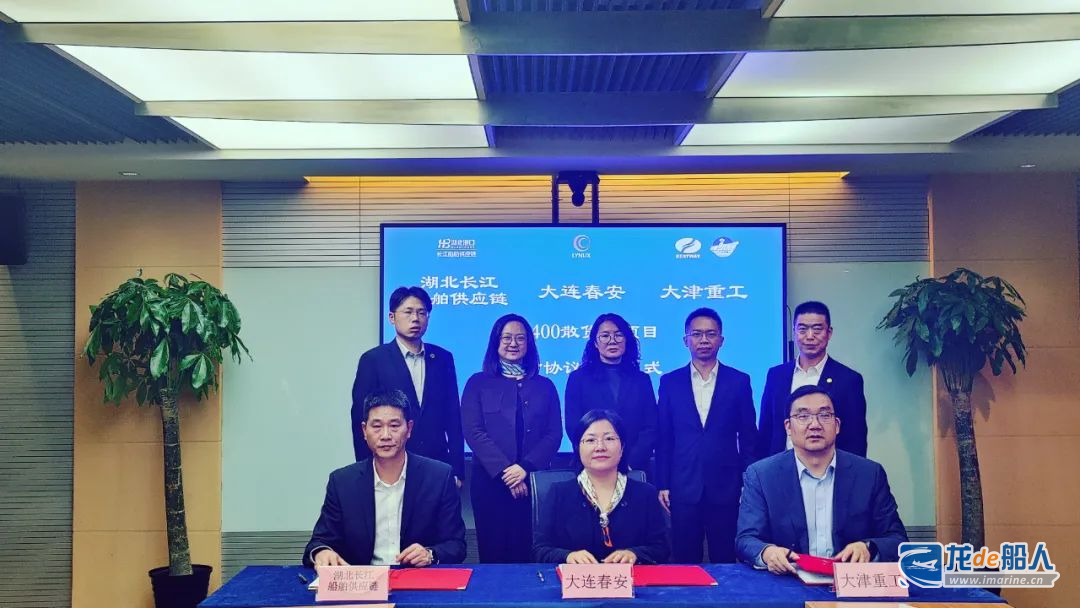 近日,大连春安航运有限公司、湖北港口集团湖北长江船舶供应链有限责任公司(简称长江船舶供应链)与天海融合防务装备技术股份有限公司旗下大津重工携手合作,共同签订2艘40400吨散货船舶建造合同。