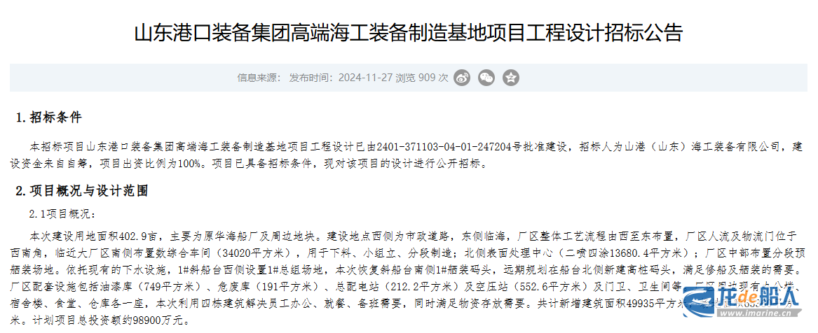 近日,山东省港口集团旗下山港(山东)海工装备有限公司发布招标公告,对海工装备制造基地项目工程设计进行招标。
