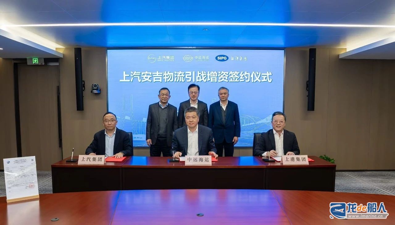 12月16日,上汽安吉物流引战增资签约仪式在上汽集团总部举行。在中远海运集团、上港集团、上汽集团三方领导的共同见证下,中远海控、上港集团和安吉物流进行引战增资签约。