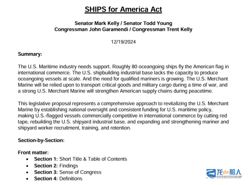 法案由参议员Mark Kelly(民主党-亚利桑那州)、Todd Young(共和党-印第安纳州)、众议员John Garamendi(民主党-加利福尼亚州)和Trent Kelly(共和党-密西西比州)提出,并得到了多个海事相关组织的支持,包括美国造船商理事会、美国造船供应商协会、美国港口管理局协会等。