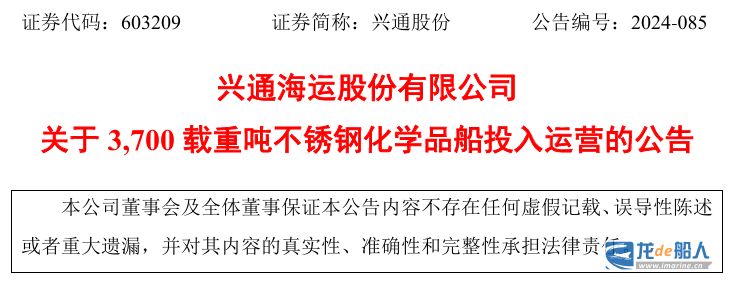 12月25日,兴通海运股份有限公司(以下简称“兴通股份”)发布《 关于 3,700 载重吨不锈钢化学品船投入运营的公告》。