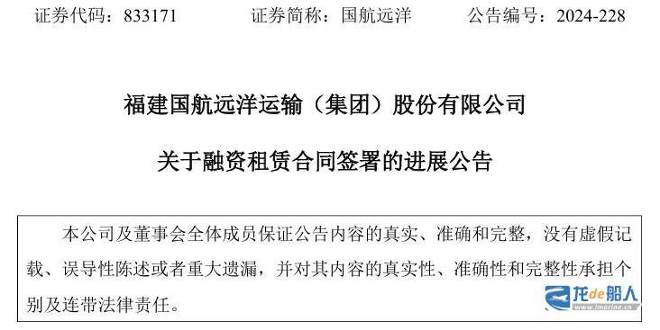 12月31日,福建国航远洋运输(集团)股份有限公司(以下简称“国航远洋”)发布《关于融资租赁合同签署的进展公告》。