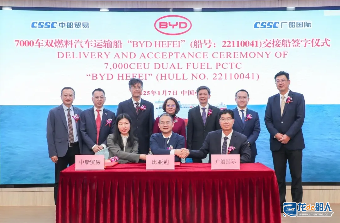 1月7日,中国船舶广船国际为比亚迪建造的7000车双燃料汽车运输船1号船“比亚迪 合肥(BYD HEFEI)”号命名交付。
