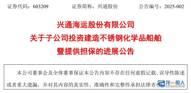 1月9日,兴通海运股份有限公司发布《关于子公司投资建造不锈钢化学品船舶暨提供担保的进展公告》。