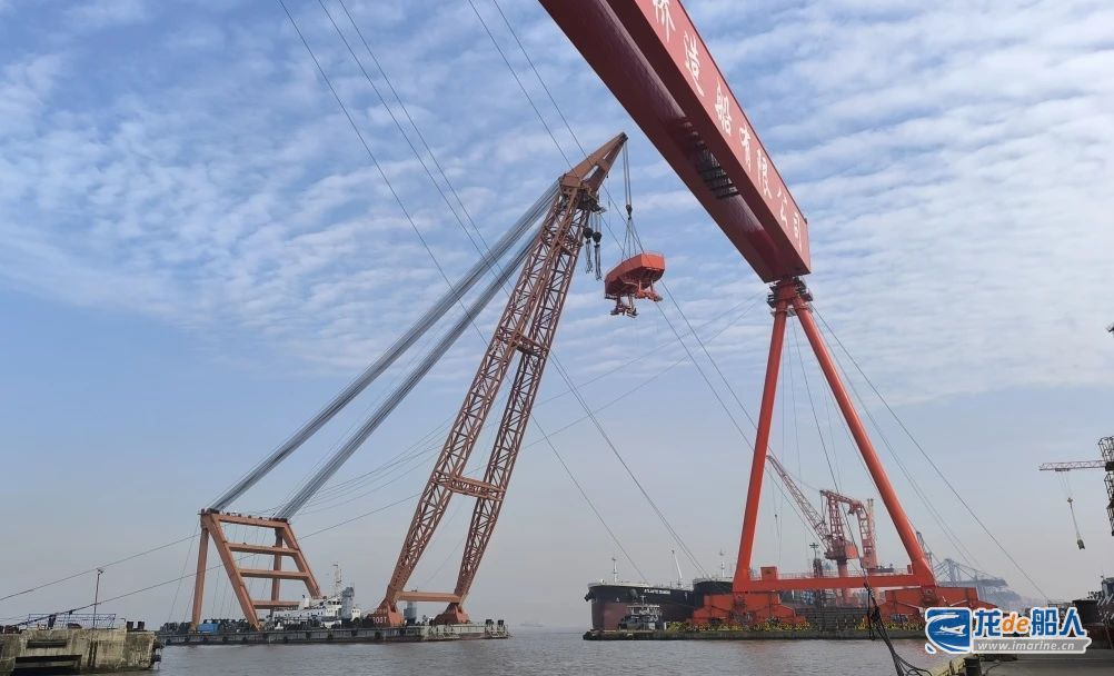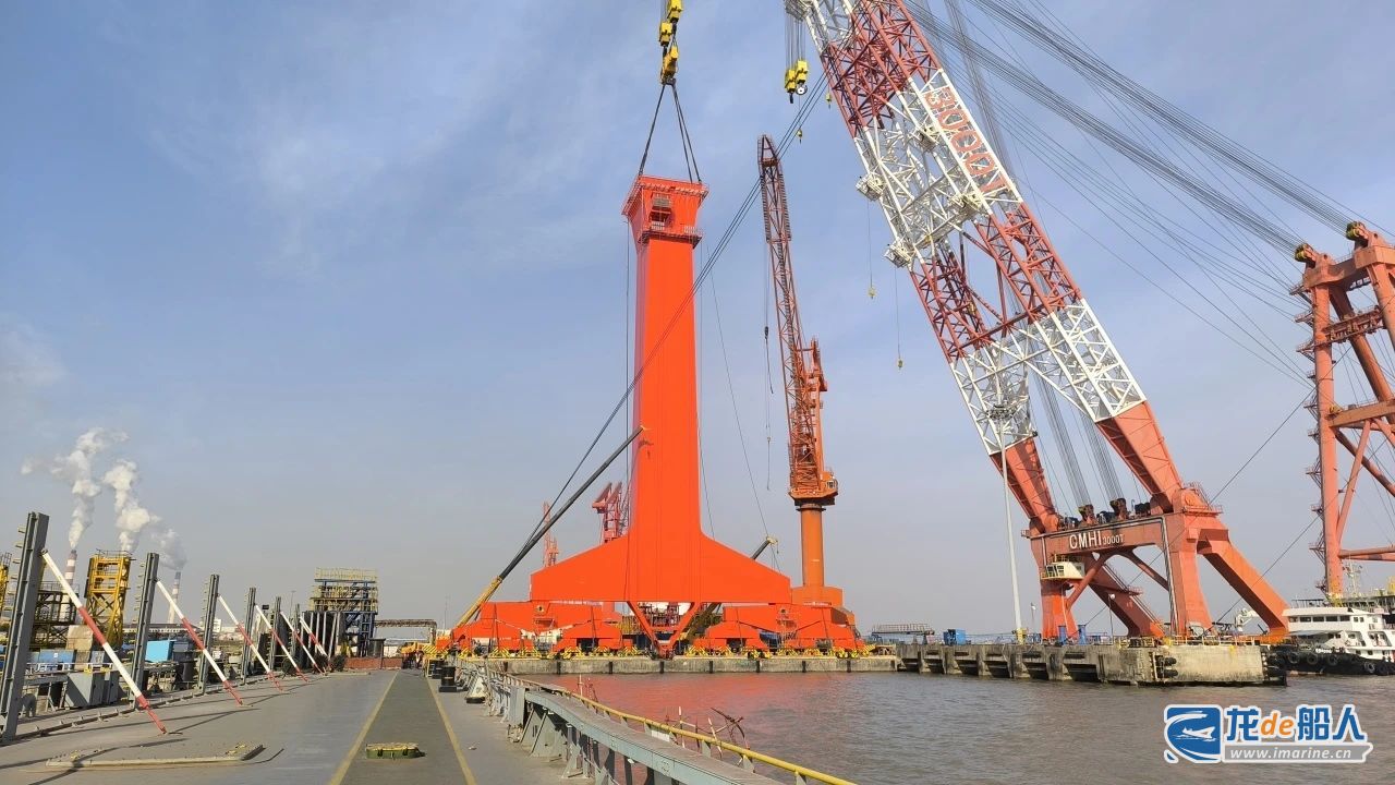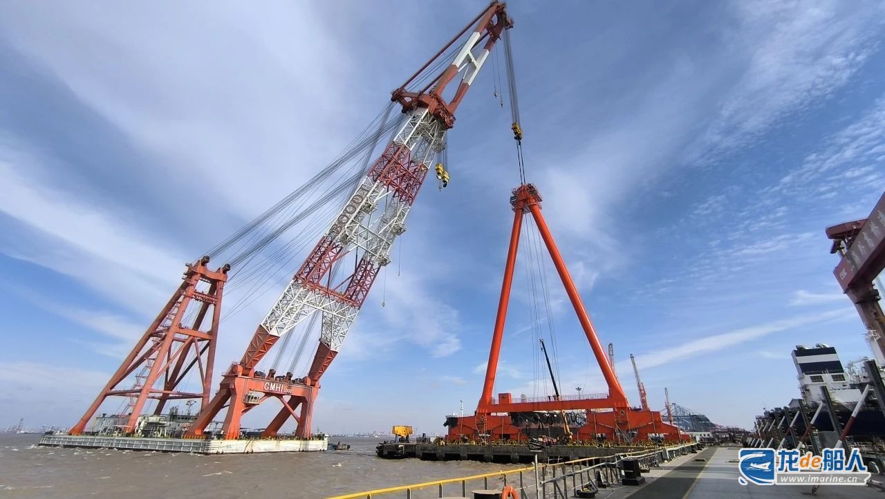 该项目由中船九院设备院总承包,位于上海外高桥造船1号船坞坞口,轨道跨度185米,起升高度 76 米,其吊装方式为浮吊吊装,是该公司首次采用的新工艺,不仅节约了场地,还缩短了施工周期,极大的提升了效率。