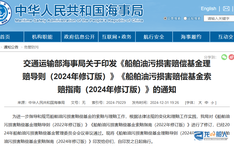 为进一步指导和规范船舶油污损害赔偿基金的索赔与理赔工作,根据法律法规的变化和理赔工作实践,中国海事局对《船舶油污损害赔偿基金理赔导则(2022年修订版)》《船舶油污损害赔偿基金索赔指南(2022年修订版)》进行了修订,已经2024年船舶油污损害赔偿基金管理委员会会议审议通过。