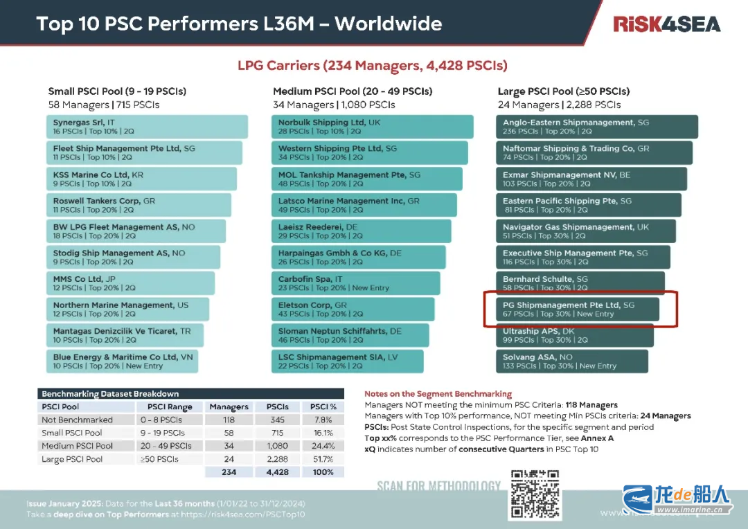 根据2025年1月RISK4SEA SaaS PSC智能平台发布的最新报告,山东海洋集团气体船旗下PG Shipmanagement Pte Ltd跻身全球液化气体船PSC检查得分前列,标志着集团清洁能源气体船队的安全运营管理能力和水平获得高度认可。
