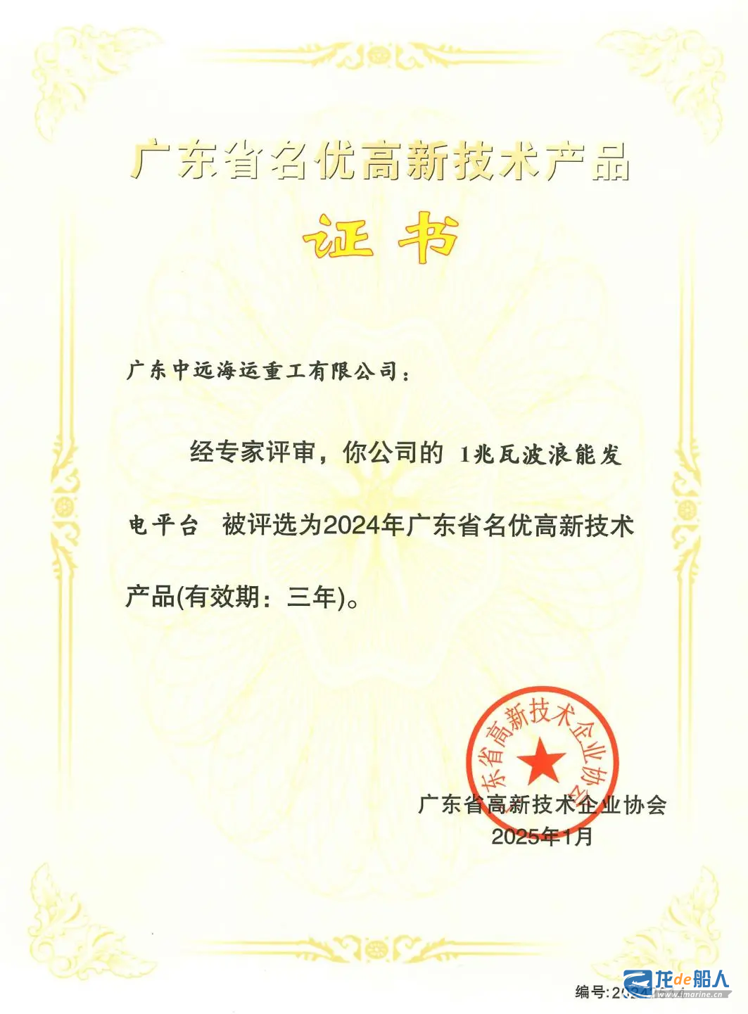 近日,广东中远海运重工在科技创新领域取得新成果,顺利通过国家高新技术企业认定,公司将连续18年保持这一荣誉。同时,承建的兆瓦级波浪能发电平台项目荣获“广东省名优高新技术产品”称号。