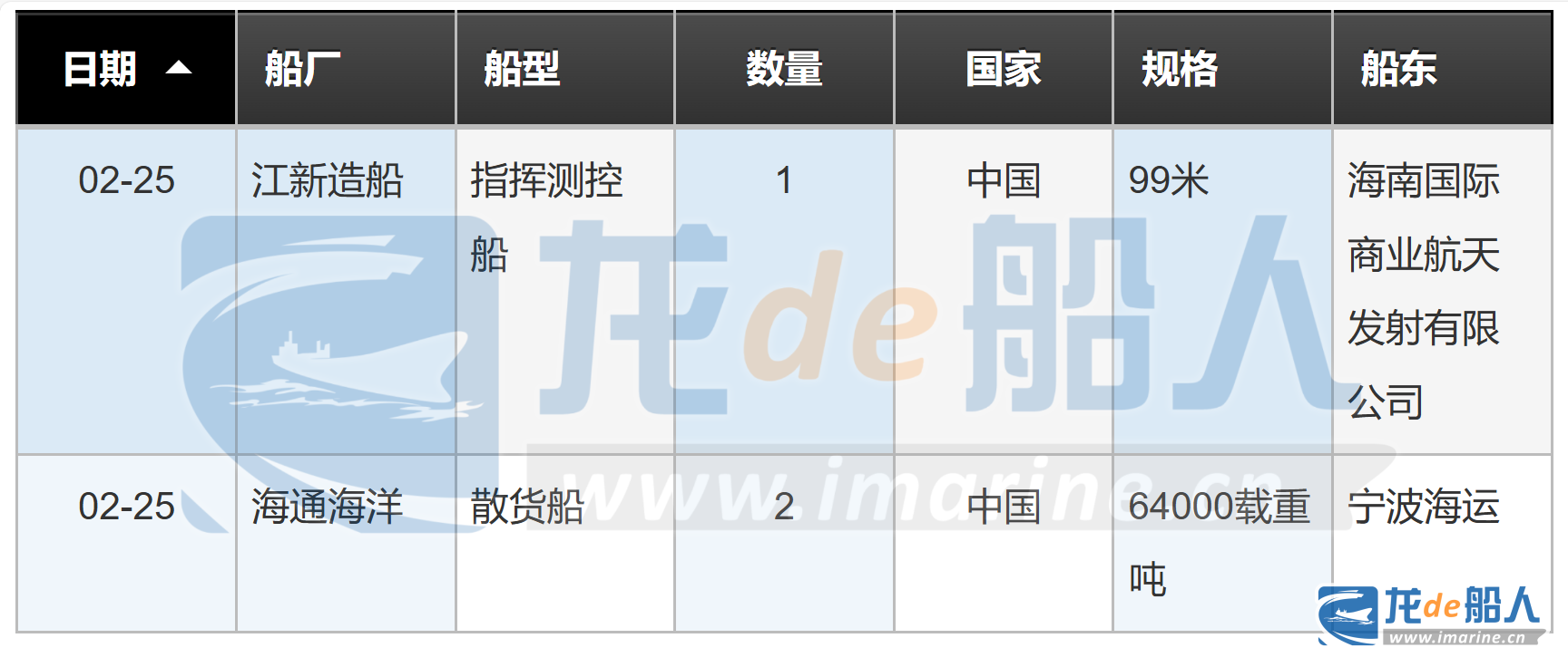 新船订单汇总(2.24-3.2):上周3艘! 来源:龙de船人 2025-03-03 10:43 据龙船订单库(https://www.imarine.cn/order)跟踪统计,上周(2.24-3.2)公布的新船订单有3艘。 其中,江新造船获1艘指挥测控船EPC项目订单;海通海洋2艘6.4万吨散货船订单生效。 本站文章如未标明来源,均为本站编译、编辑或原创文章,转载请注明来自“龙de船人”,违者必究。