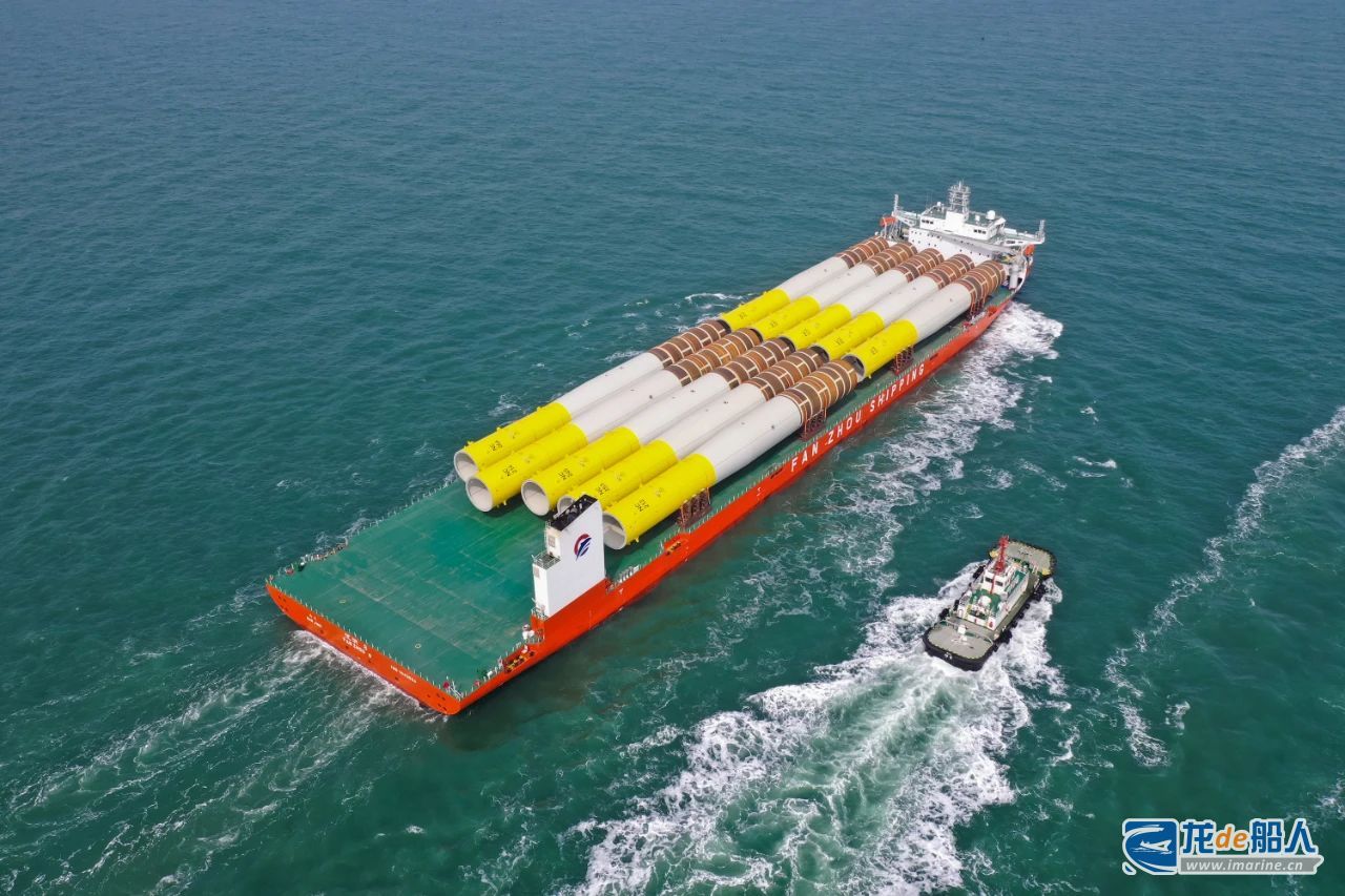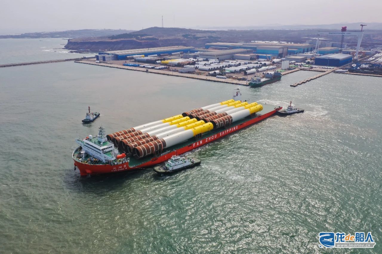 烟台海事消息,3月15日,装载10根大型风电单桩的“泛洲8”轮从蓬莱顺利启航,驶往荷兰。这是这艘全球最大载重甲板货船的首次载货营运。